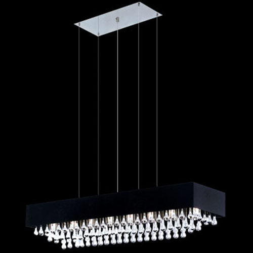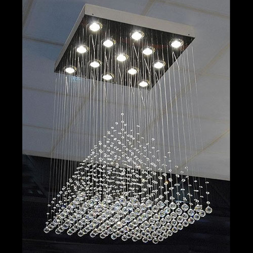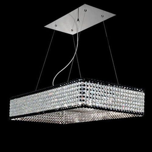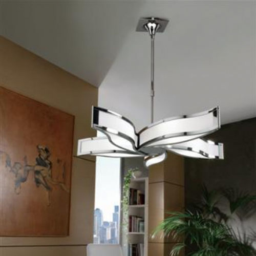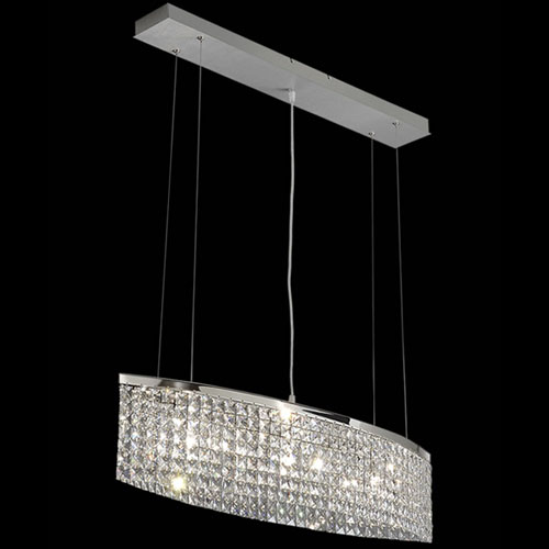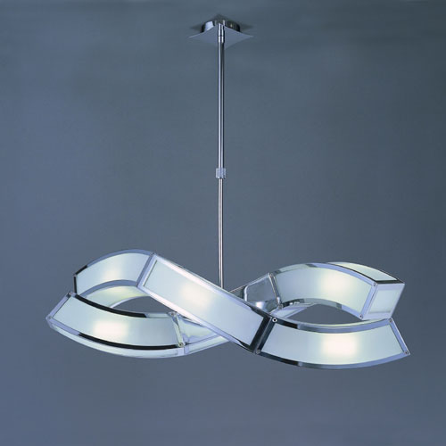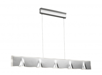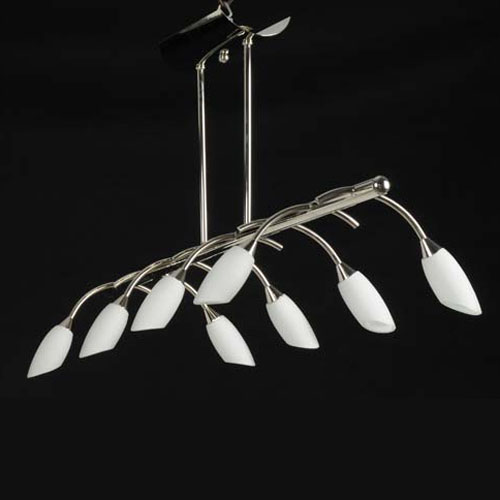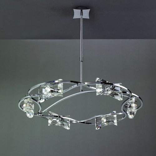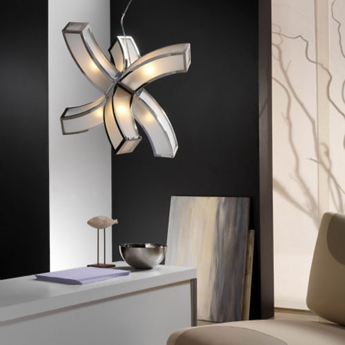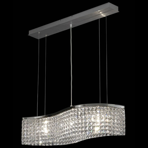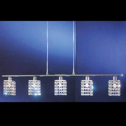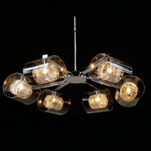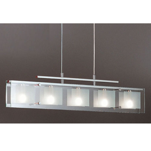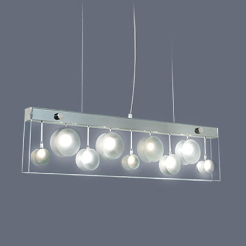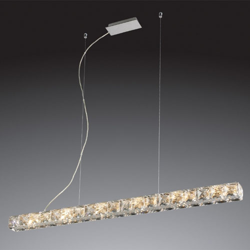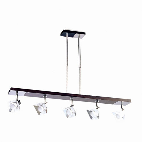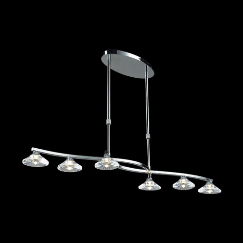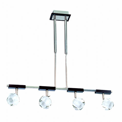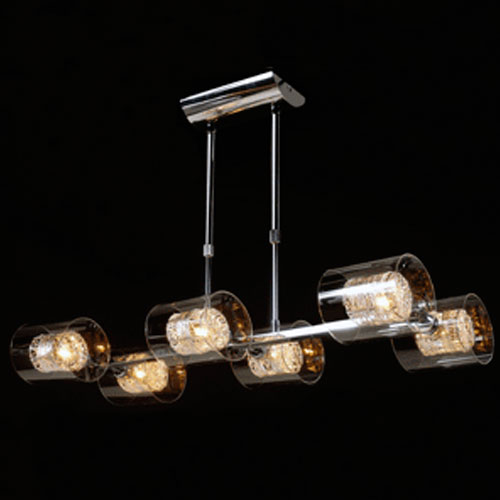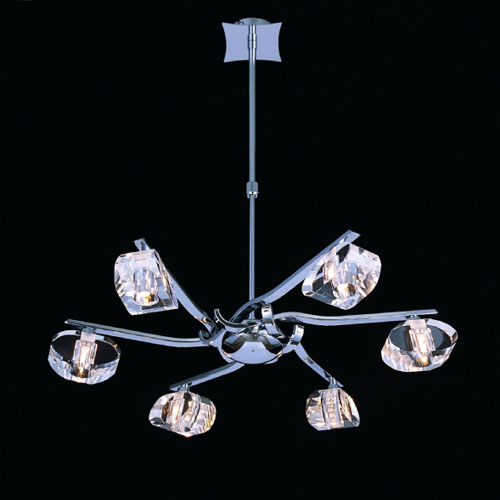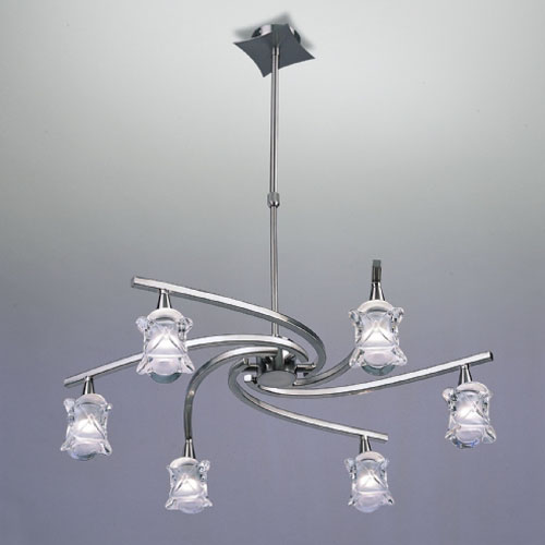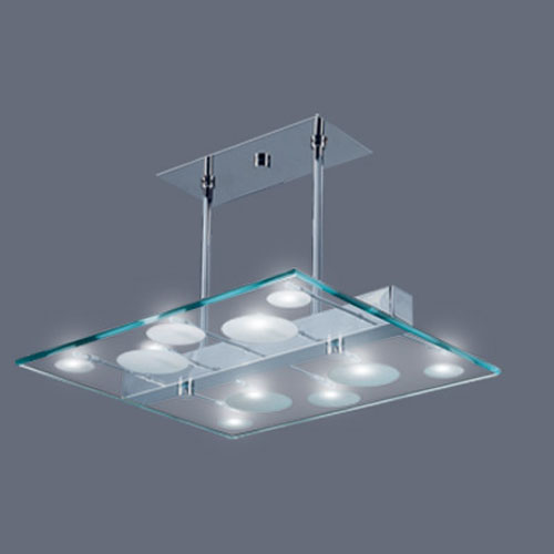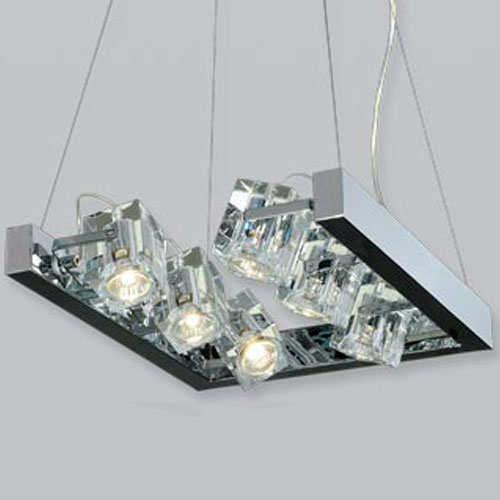 Colgante en suspensión con tulipas de cristal cuadradas y estructura en caño cromado para 6 luces halogenas.