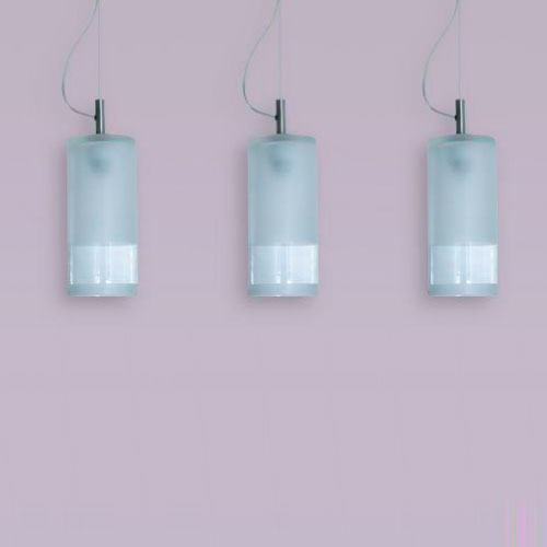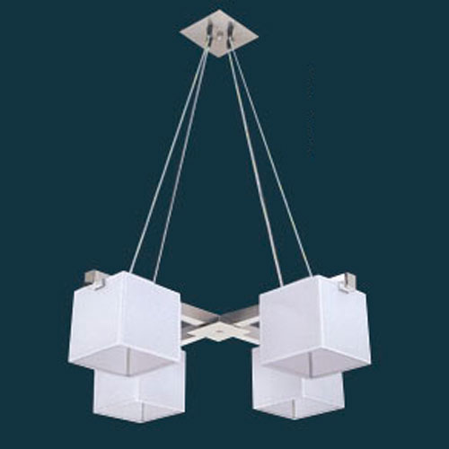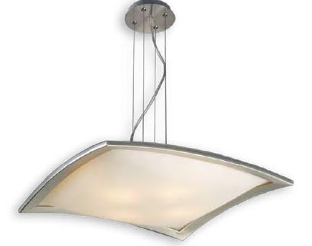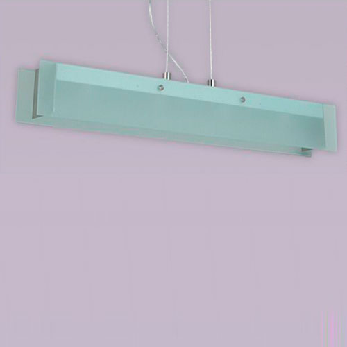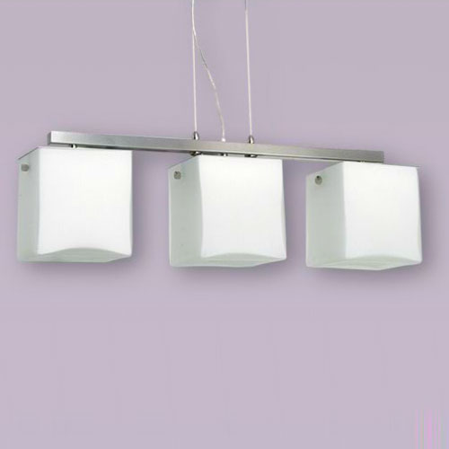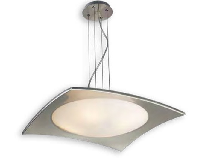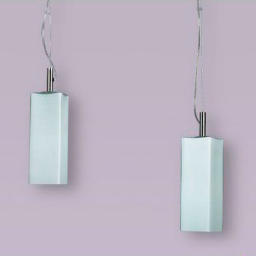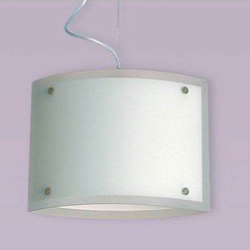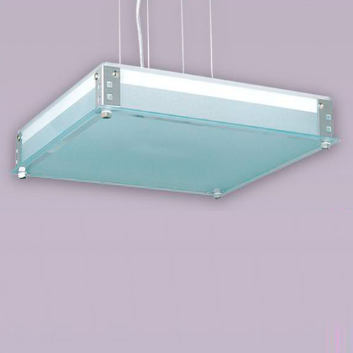 Colgante en vidrio opal satinado con detalles platil o cromo sobre base rectangular.