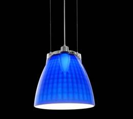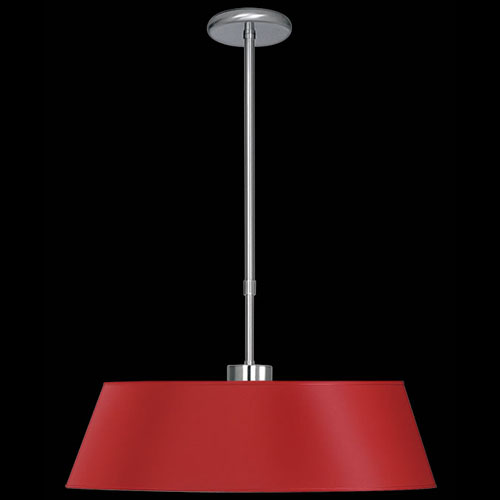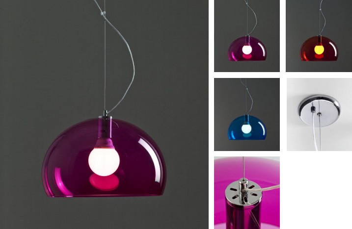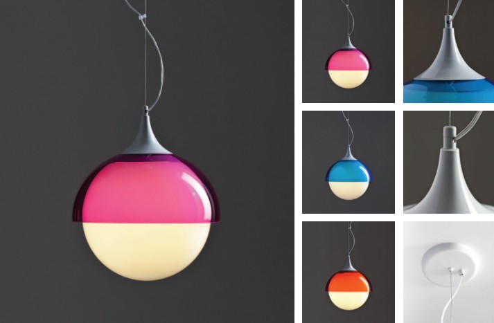 Colgante pantalla redonda de vidrio transparente con detalles en platil y cromo. Disponible en colores rojo, verde, azul, ámbar, naranja y blanco.