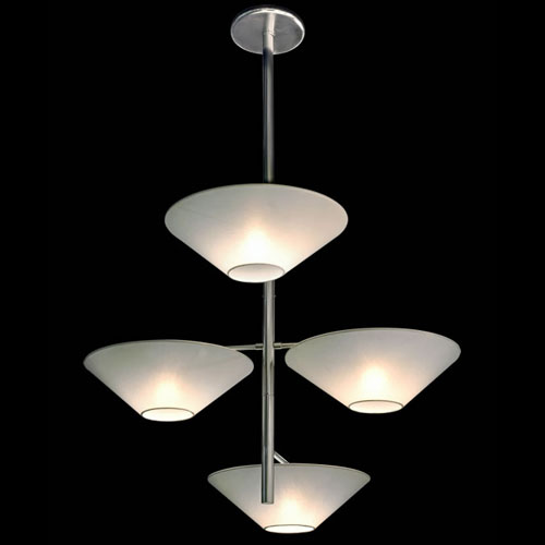 Línea de colgante y plafón de techo amplio con tulipa en vidrio opal satinado, de ø 45 cm que alberga en su interior 4 luminarias. Detalles en platil.