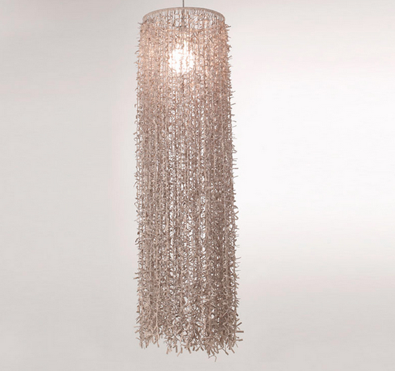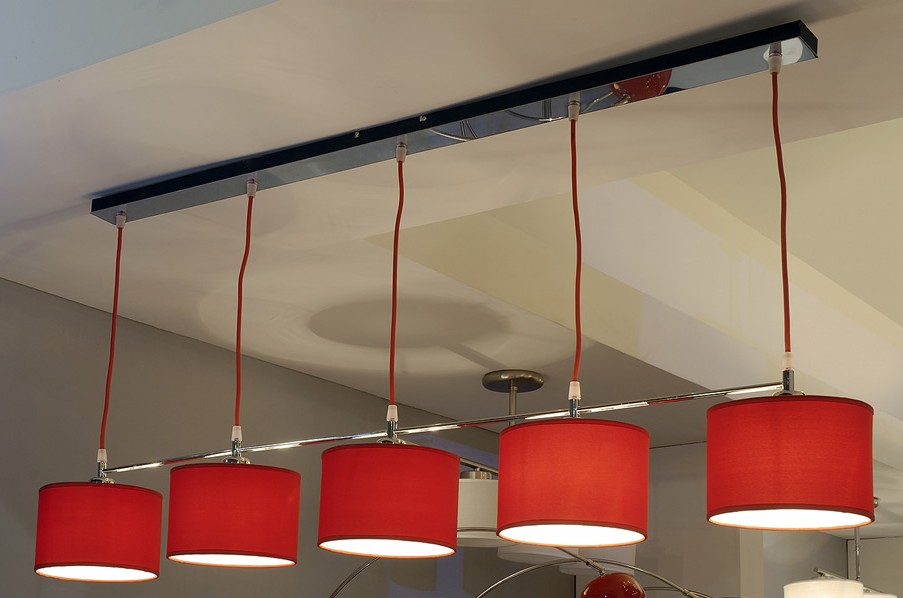 Colgante telescopico 5Luces con cable tejido, pantalla de lino. Niquel Brillante con cable tejido Blanco - Violeta - Verde - Azul - Rojo - Naranja - Amarillo - Negro