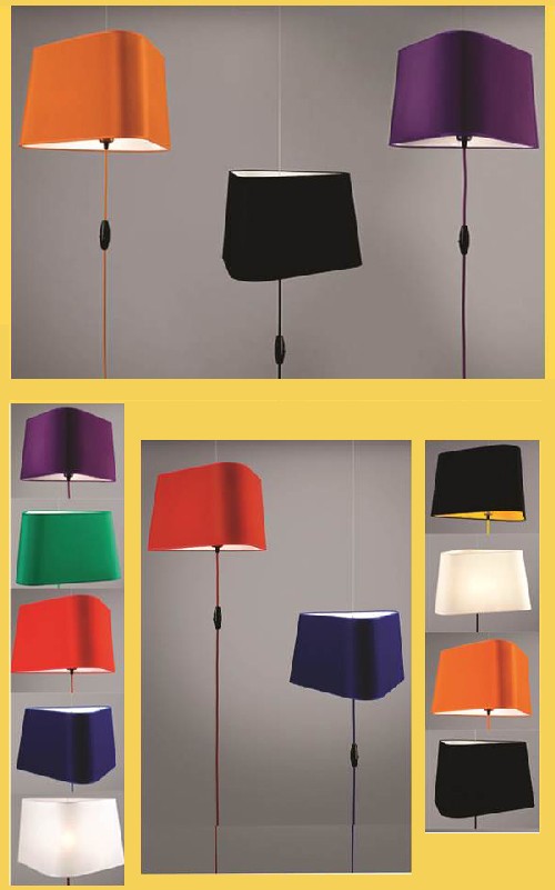 Diseño elegante que combina telas en 2 colores, cable textil de color. Acrílico transparente Tela Madraz liso Base en cromo Tensores de acero Cromo de espesor.