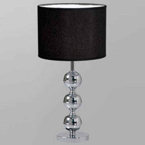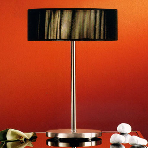 Lámpara de mesa. Acabado cromo. Capiteles negros. Pantallas en hilo de seda.