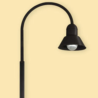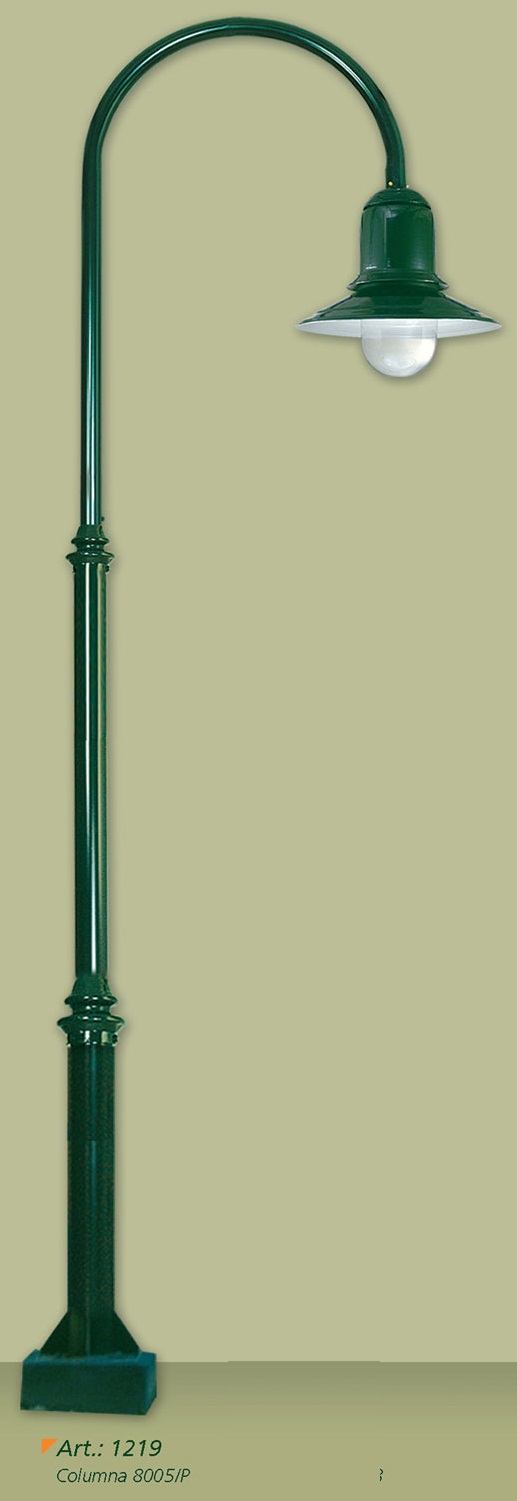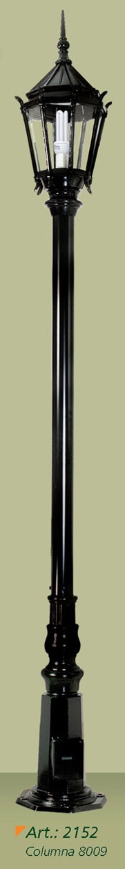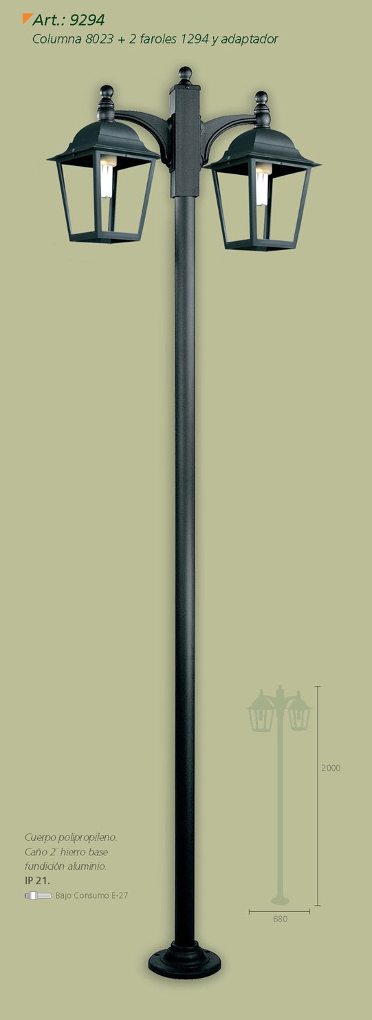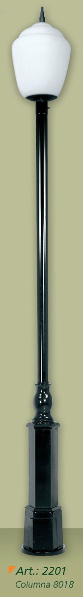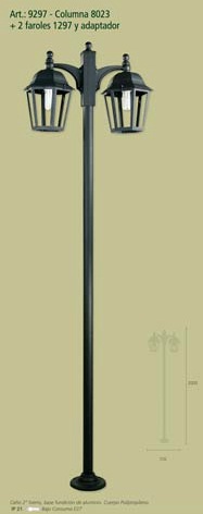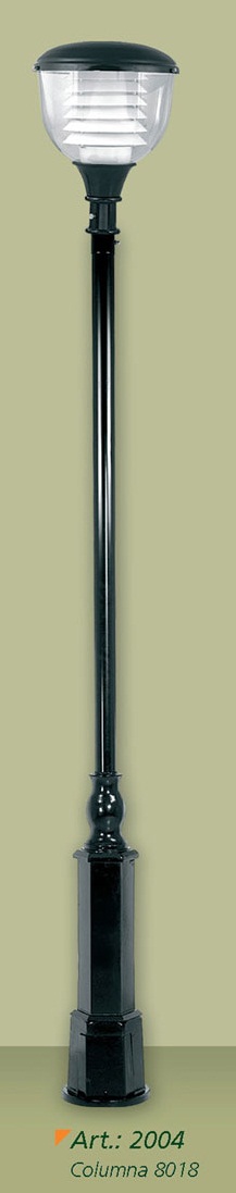 Farola, cuerpo de aluminio, base y caño de acero. Difusor de policarbonato transparente.
