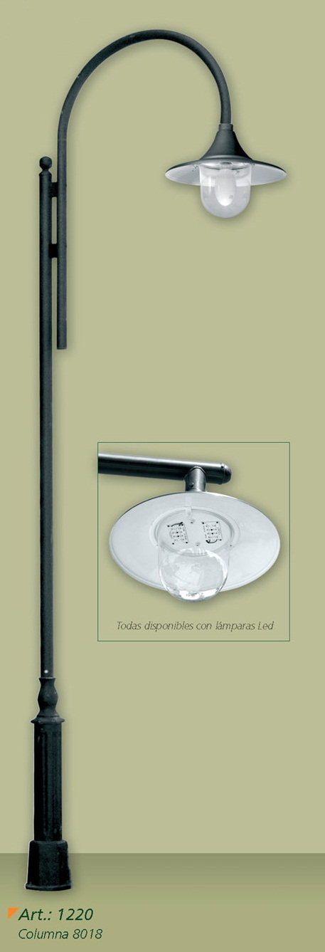 Farola, cuerpo del proyector de aluminio, soporte y caño de acero. Difusor de acero esmaltado.